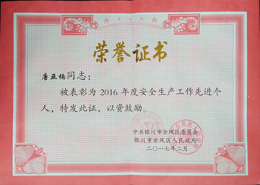 唐亞楠總經(jīng)理榮獲“2016年度安全生產(chǎn)工作先進(jìn)個(gè)人”榮譽(yù)稱號