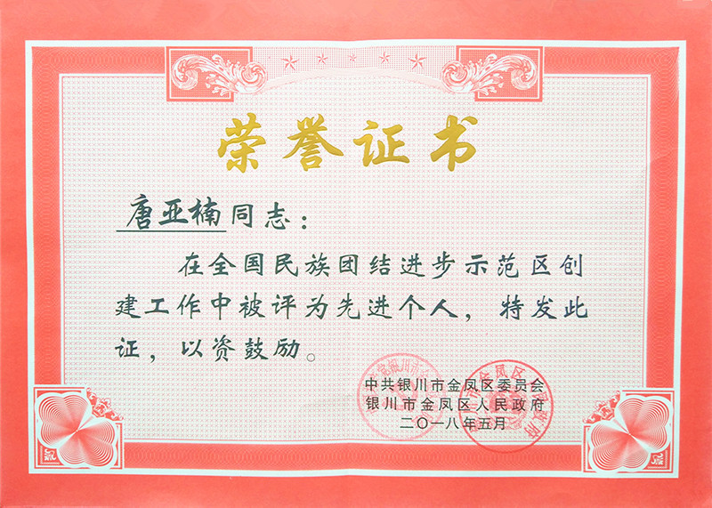 唐亞楠被評為全國民族團結進步示范區創建工作先進個人