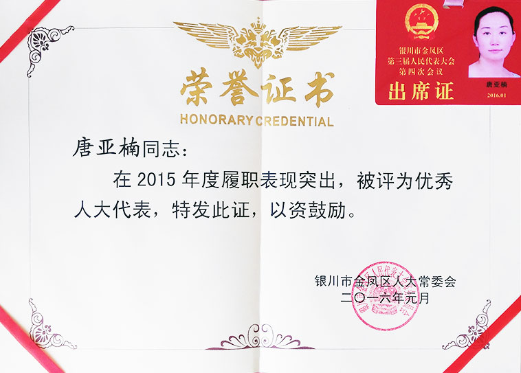 唐亞楠總經理被評為金鳳區三屆人大優秀代表