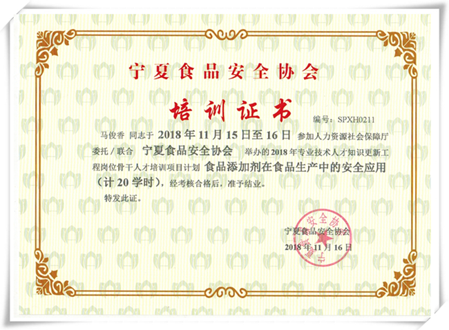寧夏食品安全協會培訓結業證書
