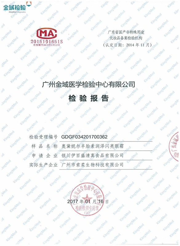 奧黛妮爾羊胎素潤澤修護精華液檢驗報告