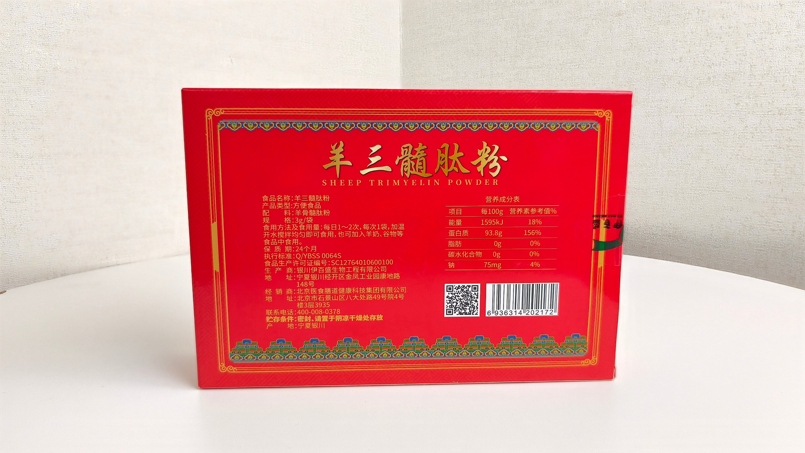 【食品名稱】:羊三髓肽粉【產品類型】:方便食品【配 料】:羊骨髓肽粉【規 格】:3g/袋【食用方法及食用量】:每日1~2次,每次1袋,加溫開水攪拌均勻即可食用, 也可加入羊奶、谷物等食品中食用。【保 質 期】:24個月【執行標準】:Q/YBSS 0064S【食品生產許可證編號】:SC12764010600100【生 產 商】:銀川伊百盛生物工程有限公司【地 址】:寧夏銀川經開區金鳳工業園康地路148號【貯存條件】:密封、請置于陰涼干燥處存放【產 地】:寧夏 銀川