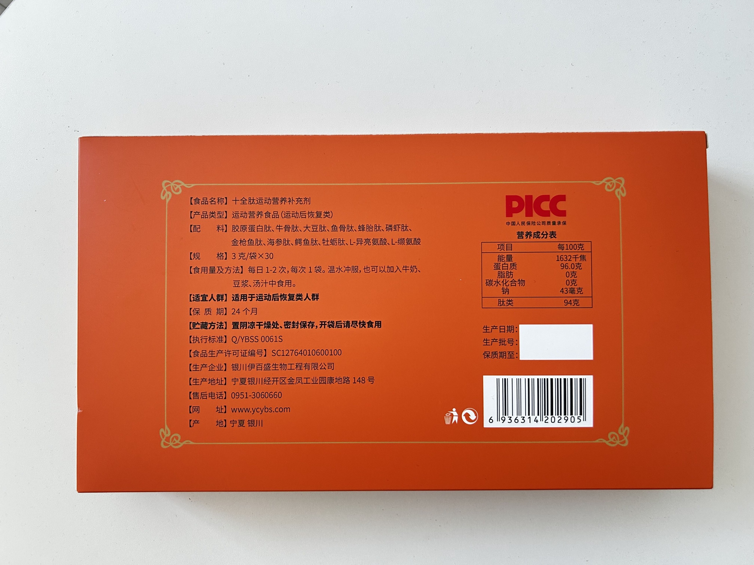 【食品名稱】十全肽運動營養補充劑【產品類型】運動營養食品(運動后恢復類)【配 料】膠原蛋白肽、牛骨肽、大豆肽、魚骨肽、蜂胎肽、磷蝦肽、金槍魚肽、海參肽、鱷魚肽、牡蠣肽、L-異亮氨酸、L-纈氨酸【規格】3 克/袋x30【食用量及方法】每日 1-2 次,每次1袋。溫水沖服,也可以加入牛奶、豆漿、湯汁中食用。【適宜人群】適用于運動后恢復類人群【保 質 期】24 個月【貯藏方法】置陰涼干燥處、密封保存,