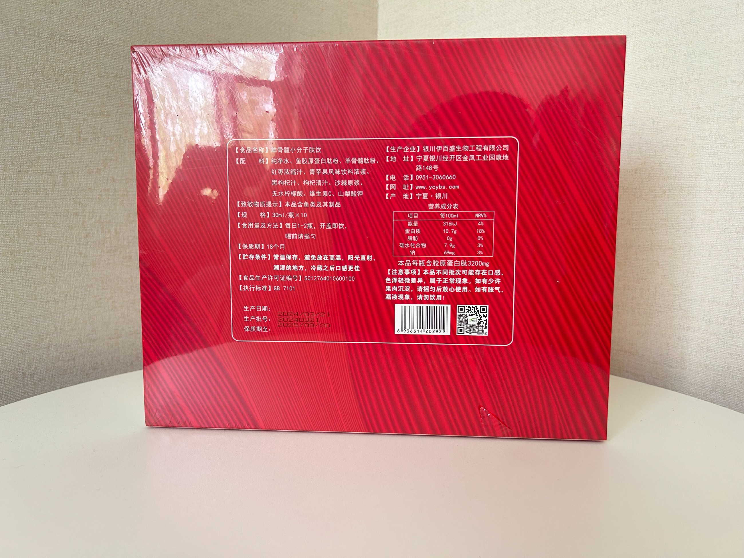 【配料】純凈水、魚膠原蛋白肽粉、羊骨髓肽粉、紅棗濃縮汁、青蘋果風味飲料濃漿、黑枸杞汁、枸杞清汁、沙棘原漿、無水檸檬酸、維生素C、山梨酸鉀